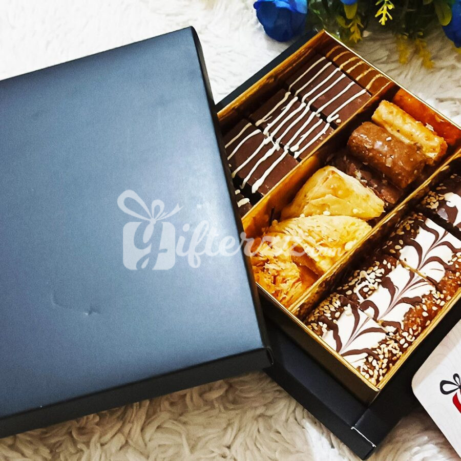 Celebrate festive with your loved ones by sending them Baklava with Chocolates and Dates Sweets in prestigious presentations.  A combination of wishful blessings beautifully wrapped with a ribbon bow.