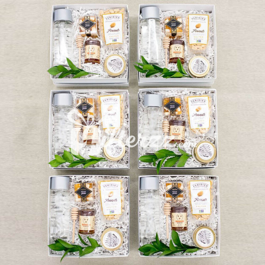 Ramadan Corporate Gift Hamper For celebrating Ramadan with your loved ones by sending them the original honey jar, peanuts, Zamzam water bottle, mixed cookies pack, and date jar in prestige presentation. A combination of wishful blessings in the holy month of Ramadan wrapped with a ribbon bow.